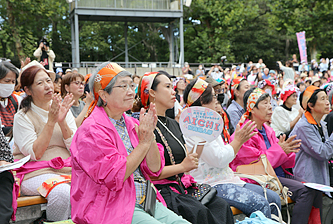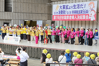 今回のスローガンは「大軍拡より生活だ!なくせ消費税!なくせ所得税法第56条!」。オープニングのファッションショーでは9県婦協が、「56条は廃止」などをデコレーションしたうちわ、金や青、オレンジなどおそろいのTシャツやエプロン、民商の宣伝のぼりをパッチワークした法被、フラダンスの衣装などで登場。目にも楽しいにぎやかなステージに、婦人部員の母親とともに参加した子どもたちも手を振りました。