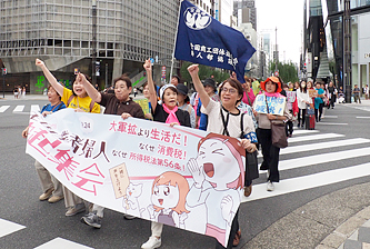 8歳の娘と一緒に、集会に初めて参加した青森・弘前民商婦人部のIさん=美容・化粧品販売=は、美容関連の会社員から出産を機に独立。「1歳の息子もいます。子育てに融通が利くと思い、自営の道に進みましたが、国保には傷病手当や出産手当が無く、商売をする女性は子育てに不利だと思い知りました。ずっと前から私たちの厳しい状況を、国に伝えたかった」と話します。「つわりがひどくても、業者は休んだ分だけ生活費がマイナスになる。私は病院で注射を打ちながら働きました。傷病手当や出産手当などがあれば、女性経営者も増えるはずです。集会やデモを通じて1人でも多く、56条や国保の問題に興味を持ってもらえたら」と、子どもと一緒に銀座の街を歩きました。