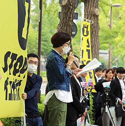 STOP!インボイスの小泉なつみさんは「インボイスは、売り上げ300万円のフリーランスから消費税を10万円も奪う。地域を支える中小業者を追い込んでいる」と糾弾しました。