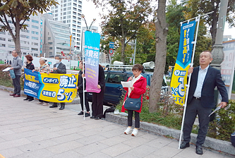 北海道連も加盟する消費税廃止北海道各界連は、10人が集まり、札幌大通公園で「怒りの宣伝行動」を実施。マイクを握った北海道連の尾谷幸子副会長は「大企業の内部留保が過去最高の561兆円になる一方、国民の世帯所得は1割以上減少した。消費税の課税事業者は、赤字でも納税を迫られる」と強調。「消費税減税を実現させよう」と訴えました。