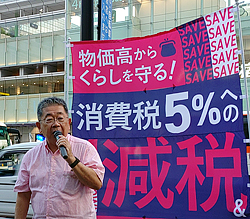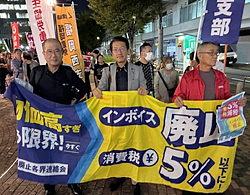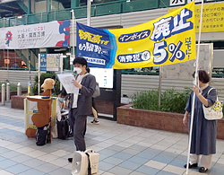 全国商工団体連合会(全商連)も加わる消費税廃止各界連絡会(各界連)は9月24日、消費税の減税とインボイス(適格請求書)制度の廃止を求める定例宣伝を東京・JR新宿駅南口で実施しました。