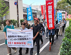 集会後、滋賀県庁周辺をデモ行進。「消費税は5%に減税せよ」などと元気にアピールしました。