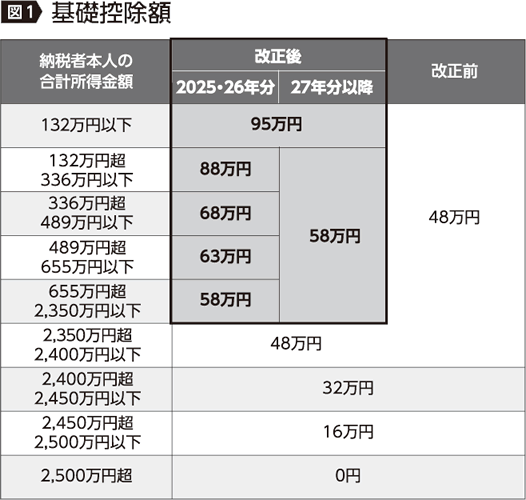 A 基礎控除は改正前では、合計所得2400万円以下は一律48万円でした。25年度税制改正で、この一律48万円が改正され、合計所得2350万円以下は25年分以降の所得税から、合計所得金額に応じて5段階の控除額となります(図1)。