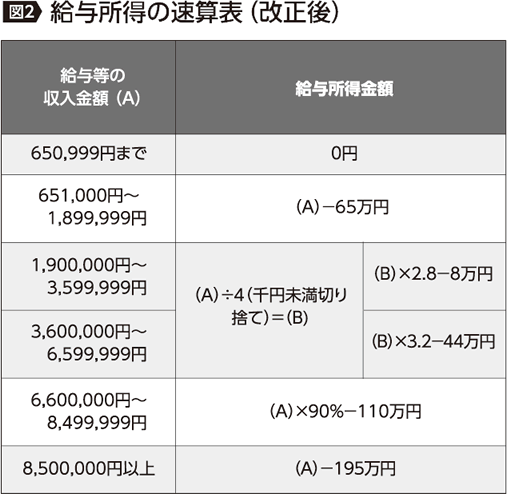 A 給与所得控除は、給与の収入金額によって段階的に控除額が決まります。改正前の控除額は、上限195万円~55万円の7段階でしたが、今回の改正で、給与収入190万円以下の人に限り、最大10万円増額され65万円となりました。給与所得の速算表(図2)は、大幅に変更されているので、注意してください。