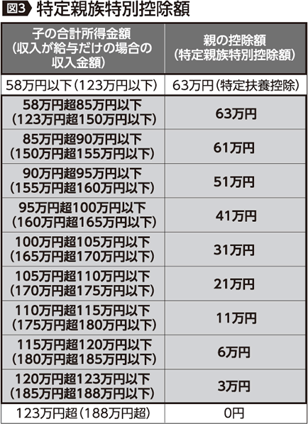 つまり、特定親族特別控除とは「19歳以上23歳未満の子等」がいる場合には、その子等の給与収入が150万円以下(所得金額85万円+給与所得控除65万円)であれば、その親は、63万円の特定親族特別控除を受けることができます。子の給与収入(同)が150万円を超えても給与収入が188万円(所得金額123万円+給与所得控除65万円)までは控除額が段階的に縮小していきます(図3)。