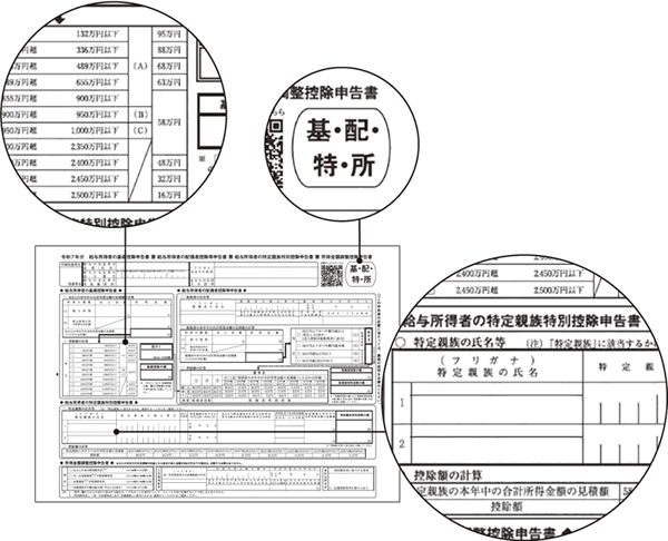 さらに、これまでの「給与所得者の基礎控除申告書 兼 給与所得者の配偶者控除等申告書 兼 所得金額調整控除申告書」(基・配・所)は「給与所得者の基礎控除申告書 兼 給与所得者の配偶者控除等申告書 兼 給与所得者の特定親族特別控除申告書 兼 所得金額調整控除申告書」(基・配・特・所)に変わります。記載内容はより複雑になっていますので、記入例を提示しながら説明することで、従業員の記載ミスなどを防いでください。