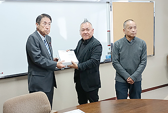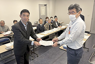 浜松市議会議長(左端)に署名を提出する浜松民商の疋田朋広会長(中央)