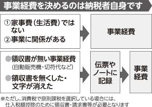 例えば、消費税法上では一般課税で計算する場合には、仕入税額控除をするために請求書等の保存を求められていますが、所得税法上では、請求書等の保存は求められていません。領収書が無いと経費にならないということはありません。