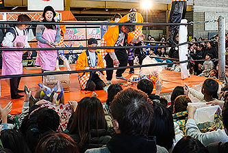 当日は、子どもや若い人が多く、熱気がありました。会員のキックボクシングジム「チャクリキ・プロモーション四国中央」と、ご当地の「愛媛プロレス」が会場内で試合をするコラボ企画も大盛り上がり。大人気の卵のつかみ取り企画は、300人近くが列をなし、用意した卵600個が、すぐ無くなりました。終盤、愛媛プロレスのレスラーや民商役員らがリング上から「お菓子投げ」「おもち投げ」を行い、最高潮に。みんなの楽しそうな姿に実行委員一同「しんどいけど、やって良かった」と実感していました。