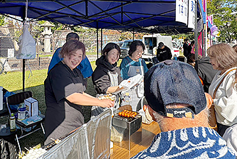 各支部の模擬店も盛況。名古屋名物「たません」(えび〈たこ〉せんべいに目玉焼きをのせ、お好み焼きソースとマヨネーズを塗り、二つ折りにした駄菓子)、おでん、中華まん、みたらし団子、焼きそば、焼き鳥、豚汁、いなりずし、五目ご飯など、全て完売しました。