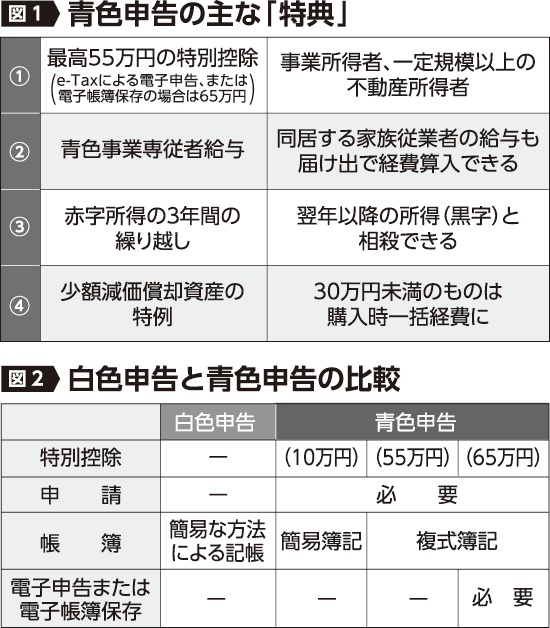 青色申告の特典として、家族従業者への給与が届出額において経費と認められる青色専従者控除制度や、青色申告特別控除制度が用意されています(図1)。