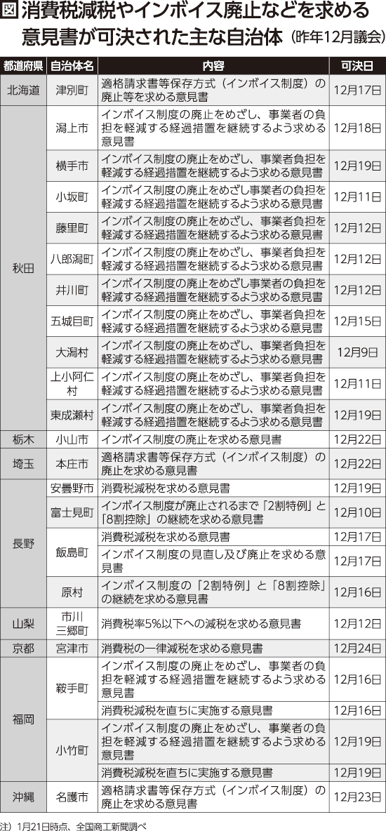 昨年の各地の12月議会で、民主商工会(民商)などが提出した消費税率の一律減税やインボイス(適格請求書)制度の廃止などを求める意見書の可決が相次ぎました(1月26日号既報)。その続報です。