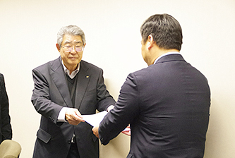 国税庁に要請書を手渡す全商連の岩瀬晃司副会長(左)=1月14日