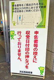 確定申告書の控えに収受日付印の押なつを行わないことを知らせる静岡・浜松西税務署入り口の立て看板