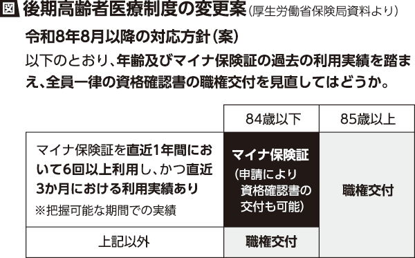 後期高齢者医療保険は、今年7月末まで、資格確認書を職権で一律交付しました。しかし、8月以降は「全員一律の資格確認書の職権交付を見直してはどうか」との対応方針案を検討(下の図)。84歳以下で、マイナ保険証の一定の利用実績がある人はマイナ保険証への移行を狙っていました。厚労省は12日、これに加えて、交付の要否の判断を広域連合に実質的に丸投げする方針を提示。「混乱は必至」との声が上がっています。