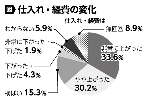 仕入れ・経費の変化については「非常に上がった」が19・8%から33・6%へと13・8ポイント増加。全体の6割以上がコスト増となっています。業種別では、料理飲食、製造販売、宿泊、建設関連への影響が際立ちます。円安・物価高騰の影響に加え、物流・エネルギーコスト、人件費の上昇など全体的なコスト増に、消費低迷による売り上げ減退という多重の困難が中小業者にのしかかっています。