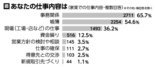 家業で自分が働いた分の報酬(給料)について、38・7%が取れておらず、「専従者控除のみ」が11・2%、特に白色申告者では「とれていない」が49・8%と高い状況です。「