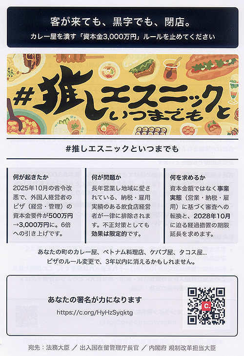 「あなたの町のカレー屋、3年以内に消えるかもしれません」―。そんな打ち出しで、2月14日にオンライン署名活動をスタート。13日現在、1万6千人超の賛同が寄せられています。賛同者からは「闇雲に小規模事業者を潰すだけの愚策としか思えない。即時撤回を望みます」「日本で大変な思いをしながらも一生懸命働き、念願の店を持った外国人の友人がいます。彼らはここで生きて働いています。こんな理不尽かつ無駄なことをして彼らを苦しめることに大反対です」などのコメントが寄せられています。