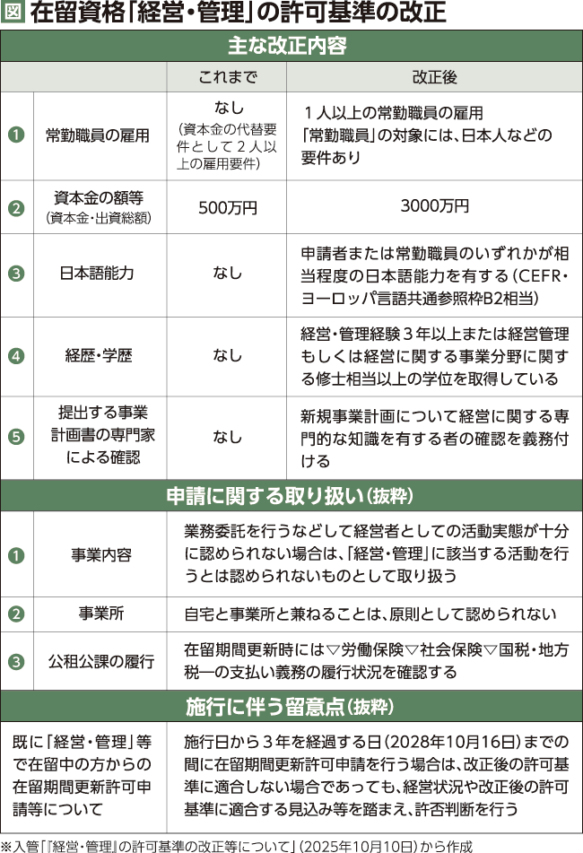 日本で起業する外国人が取得する在留資格「経営・管理」を、資本金などを500万円から3千万円に引き上げ▽住居と別の事務所の確保▽日本人常勤職員の雇用が必要▽日本語能力試験N2以上(日常的な場面での日本語の理解に加え、新聞や雑誌の解説など幅広い話題の日本語を理解できる)―などと厳格化しました。国内で事業を営む外国人経営者が要件に合致していないとみなされれば、在留資格を失い、国外退去を迫られる恐れがあります。