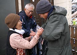 同じ商店街で民商会員の大森進さん=ネットサービス=や坂下豊県連事務局員らと再会し、無事を喜び合いました。乾電池とろうそくを手渡すと「助かった」と涙を流しました。「開業して50年。しかし店を再開するのは…借金の返済もどうなるのか」と言葉を詰まらせました。