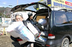 岩手県連の藤沢光一会長は3月17日、復旧したばかりのバスに乗り込み、宮古民商を訪問。両手いっぱいの救援物資と義援金を手渡しました。また、花巻民商は18日、お米や衣類などワゴン車いっぱいの救援物資を3時間かけて届けました。