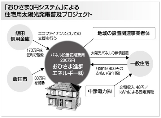 太陽光発電の開始を希望する住民に対し、おひさま進歩が地域の設置関連事業者を通して「無料」で太陽光パネルを設置(3.5キロワットの標準サイズで価格は約200万円)。飯田信用金庫は低金利のエコファイナンスで、おひさま進歩を支援(170万円)し、飯田市が独自の設置奨励金に国の補助金を加えた相当額(30万円)を同社に交付することで0円とするものです。