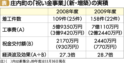 制度を活用した初年度の新・増築の工事件数は109件(うち新築25件)。翌09年度は1・5倍の158件(同22件、09年11月現在)と急増し、09年度の工事費総額は7億円を突破。町の調査でも着工数の増加分はすべて地元業者への発注で、町に建設ブームをつくりだしています(表)。