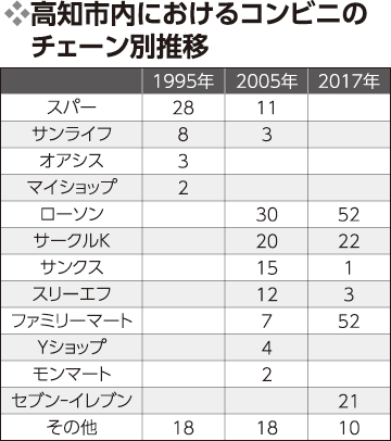 「コンビニの時代」と称されるほど、コンビニ業界はプレゼンスを高めています。1990年代以降の業界の成熟化に伴い、今、二重の意味で、業界の再編が進んでいます。その一つは、業界内部での階層分解ならびにチェーン同士の統合・提携に基づく大手3社への寡占化の進行です。もう一つが、大都市部から低密度地域への出店エリアの外延的な拡大です。特に四国は、大手資本にとっての最後の草刈り場として注目されるようになっています。高知県にも、ついにセブン-イレブンが、2015年に初出店してきました。