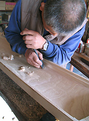 製材から仕上げまで大きく5つの工程に分かれる福山琴の製造工程。その一歩が琴の材料となる桐の木の選定です。「いい材でないといい音は出ないからね」。木目、色、硬さ、粘り…。「今ではどこ産の桐か、材木を見ただけでわかるよ」。その眼力はまるでワインのソムリエのようです。