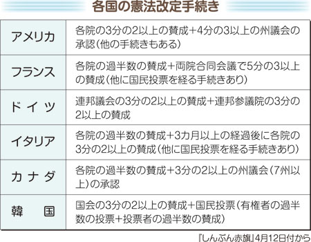 日本の憲法は「世界でも特別に変えづらい」といわれますが、別表のとおり、多くの国は通常の法律をつくるよりも厳しい規定が設けられています。これは国民主権と立憲主義の要請に立ったものです。日本だけが特別に憲法改定が難しいという主張はまったくのでたらめです。