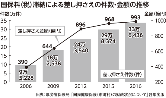 事業者、高齢者、失業者に加え、年所得200万円以下の非正規労働者が増加する国保加入者。低所得者が多く、その「4割が無職」です。加入世帯の年平均所得は、1995年には230.8万円でしたが、16年には138.8万円と92万円も激減。一方、自治体などによる差し押さえ件数・金額はこの10年間で、24万件、603億円も激増しています(図)。