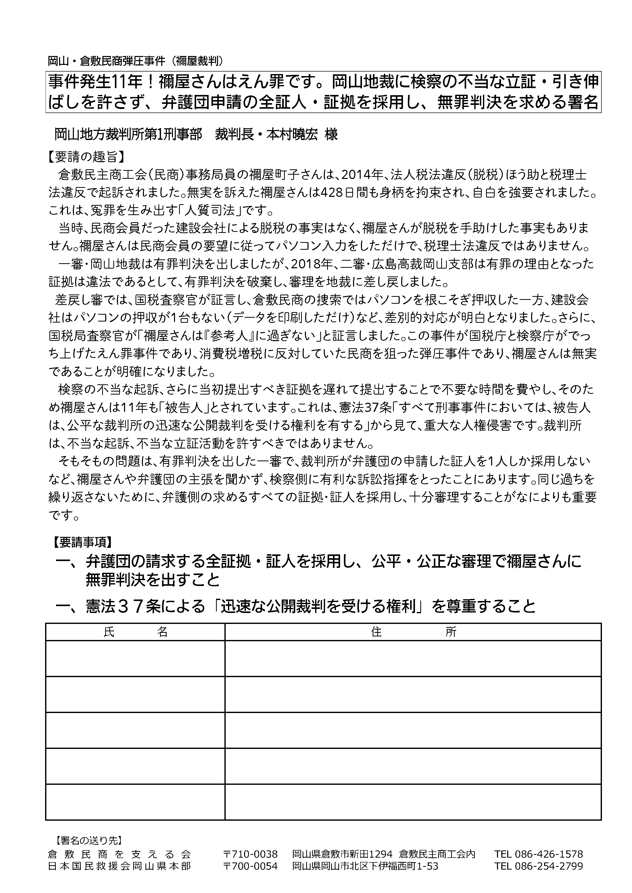 岡山・倉敷民商弾圧事件 無罪判決を求める署名
