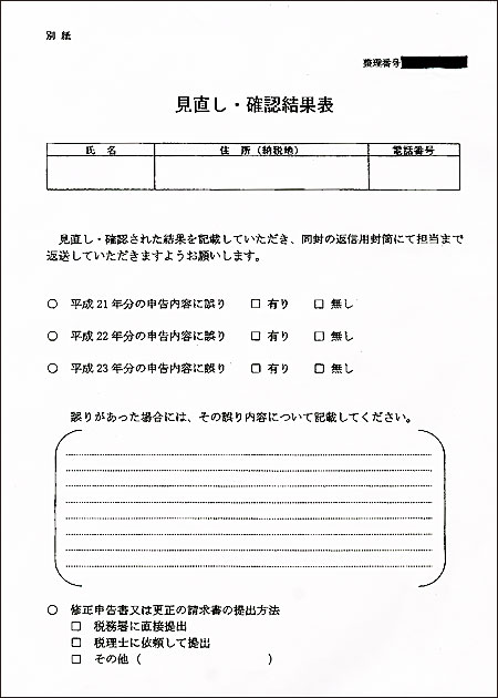 併せて、平成21〜23年分の申告内容に誤りが「有る」か「無い」かをチェックさせる欄と、「誤りの内容」を記述させる欄を設けた「見直し・確認結果表」の返送も求めています(解説参照)。