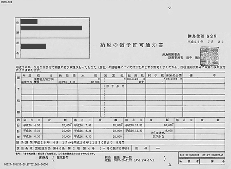 「納税の猶予」が認められたのは2013年度の消費税14万8000円で、猶予期間は今年4月から11月までの8カ月間、毎月2万円ずつを分納し、延滞税は減免されます。