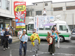 出発式の後は「岡山民商元気デー」として、駅前商店街など4カ所で対話・宣伝署名行動を展開した。表町商店街では、岡山民商会員の彩乃也純弘さん=チンドン屋=の先導で、カネや太鼓を鳴らしながら演歌の替え歌で「消費税増税反対の署名をしましょう」と呼びかけました。店の中から出てきた商店主が、「この不況下でこれ以上消費税が上がったら商売できない」と快く署名に応じるなど、300人分以上の署名が集まりました。