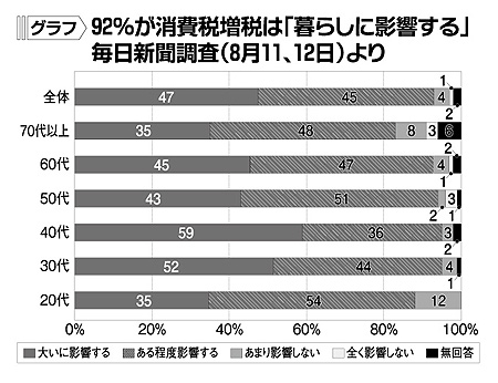 消費増税法の成立を受けて、毎日新聞が行った緊急全国世論調査(8月11、12日)では、消費税増税が「暮らしに影響する」と答えた人は「大いに」(47%)と「ある程度」(45%)を合わせ、9割を超えています。世代別にみると、「影響する」と回答したのは30〜60代で9割強。子育て世代とみられる30代で96%、40代で95%に達しています(グラフ)。