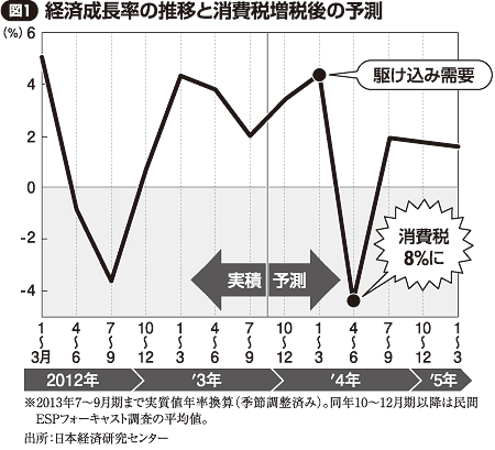 税率が8%になると家計の負担は、社会保障の負担増などと合わせて10兆円超に。国民1人当たり年間5万円超の増税になる計算です。史上空前の負担増が景気に及ぼす影響は計り知れません。日本経済研究センターによれば、駆け込み需要はあるものの増税後の4〜6月期の実質成長率はマイナス4.6%と急落(図1)。主要企業321社を対象に行った景気アンケート(「東京」4日付)では、日本経済の懸念材料として「消費税増税」が63.2%とトップ、24.6%が「悪影響が出る」と回答しています。ところが安倍政権が打ち出す経済対策は、大企業減税や復興特別法人税の前倒し廃止、大型公共事業へのバラマキなど、大企業支援ばかり。GDP(国内総生産)の約6割を占める個人消費を喚起するために家計に軸足を置いた対策こそが真の景気対策です。